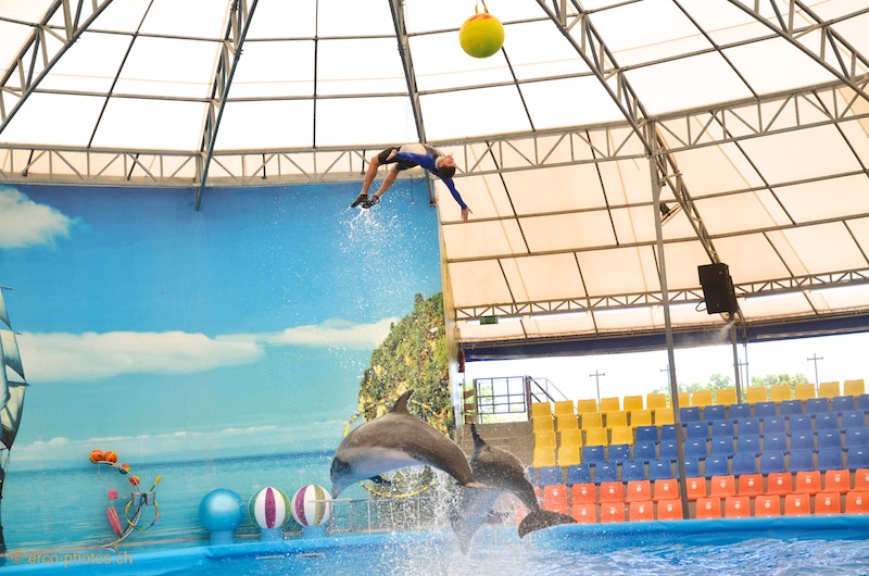 Excellent spectacle de 2 otaries en première partie, puis de 5 dauphins qui jouent à propulser en l'air leurs entraineurs. Les gradins sont classés en 3 catégories, celle du milieu est suffisante pour bien apprécié sans se faire trop gicler. Horaire des shows: 11:00 - 14:00 - 17:00. Lundi fermé.