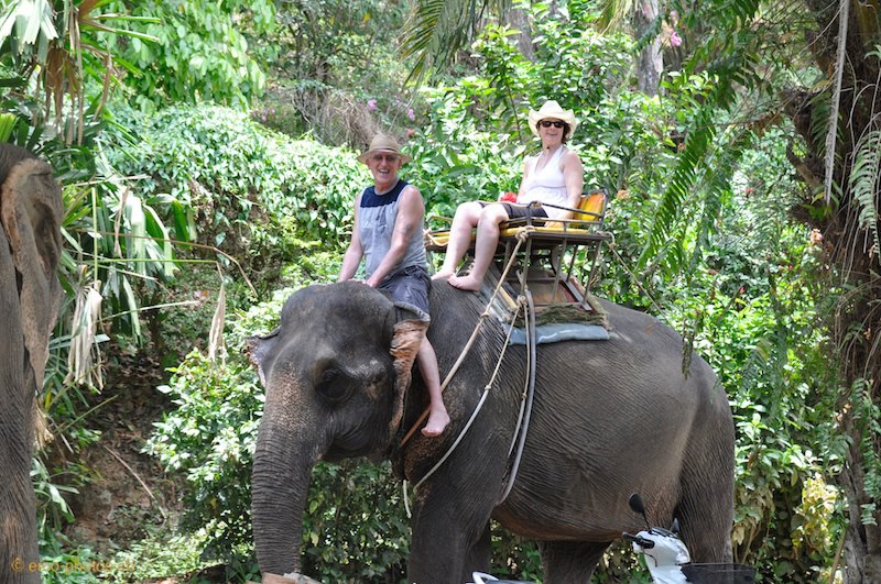 Agréable ballade en forêt sur le dos d'un éléphant. 3 durées sont proposées, mais seule la plus longue (50 min.) vous fera passer au sommet de la colline où vous découvrirez la vue sur les 2 côtés de l’île; la baie de Chalong à l’est et la mer d’Andaman à l’ouest.
